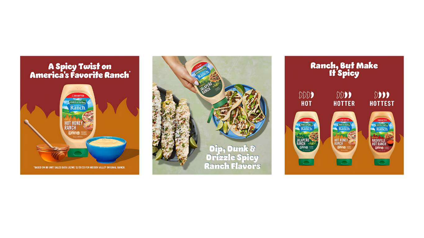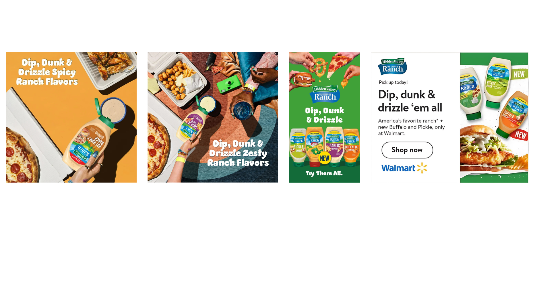 A variety of shopper assets for each flavor were released in retailers and online on National Ranch Day in 2024. The campaign featured a total of 21 of my original headlines, as well as several variations that leverage the established brand tagline: “Dip, Dunk & Drizzle.” This is the largest product launch I’ve worked on to date, with nationwide exposure across multiple channels.